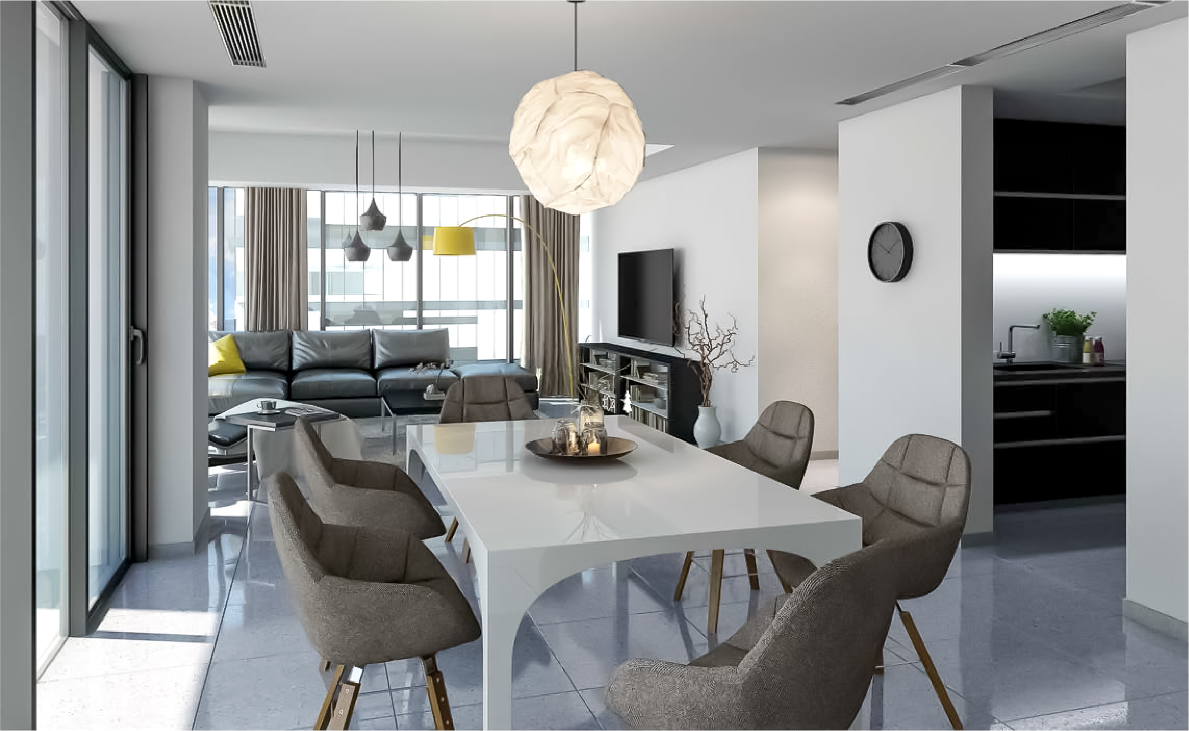 The architectural design of Lamar Residences embodies contemporary elegance through clean lines, glass façades, and a light-filled spatial layout. Interiors feature premium finishes, open-plan living areas, en-suite bedrooms, and modern kitchens equipped with high-quality fittings. Each home includes expansive balconies or terraces that open up to panoramic waterfront or landscaped podium views, perfectly balancing luxury and functionality.