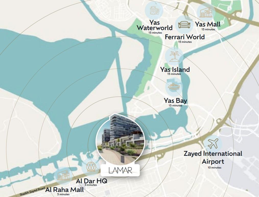 Lamar Residences is located in the prestigious Al Raha Beach area of Abu Dhabi, offering residents an unparalleled waterfront living experience with easy access to key city destinations.